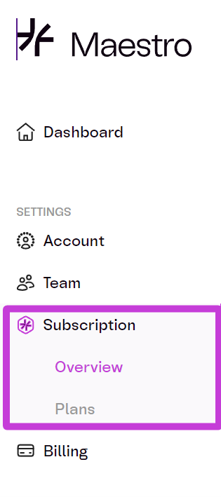 View Your SubscriptionEasily access and review the details of your subscription plan directly from the Maestro Dashboard. Whether you’re on a capped monthly plan or a pay-as-you-go plan, you can quickly check your plan type, current usage, and billing information.This guide will walk you through how to navigate to your subscription details and understand key elements of your plan, helping you stay informed and manage your account effectively.
