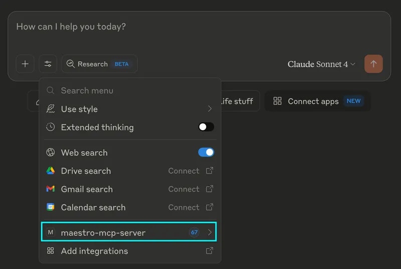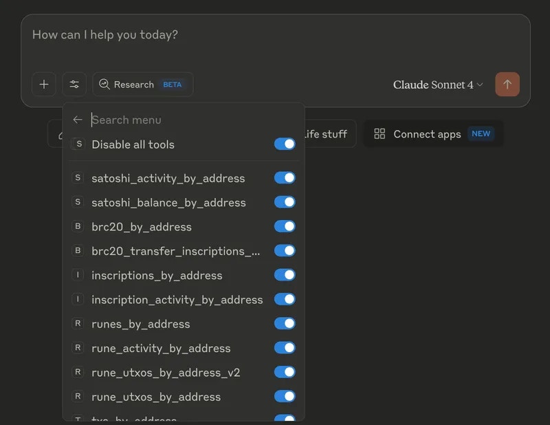 The Maestro MCP server allows for interacting with Bitcoin through the interface of an LLM client. Maestro MCP transforms how LLMs engage with the Bitcoin network, turning them into powerful, on-chain agents. Bridging Claude (or any LLM client) with our MCP server enables the LLM to query blocks, inspect transactions, analyze addresses, and even take action on behalf of the user. This server functionality provides the LLM with a set of tools for exploring blocks, transactions, addresses, and other aspects of the Bitcoin blockchain, allowing the LLM to not only retrieve and make infereances on on-chain data, but also to take action on behalf of the user; ie, serve as an agent. In this tutorial, we will use Claude Desktop client alongside the hosted Maestro MCP server to communicate with the Bitcoin network and start making intelligent, on-chain requests. For more client examples, see our Maestro MCP client examples repo and refer to our local setup if you’d like to understand how to connect Claude Desktop to a locally-running MCP server.