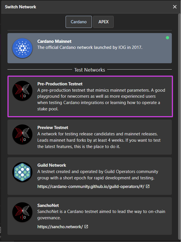 Pre-Production Testnetby selecting it from the bottom-right selector of the Eternl wallet interface.