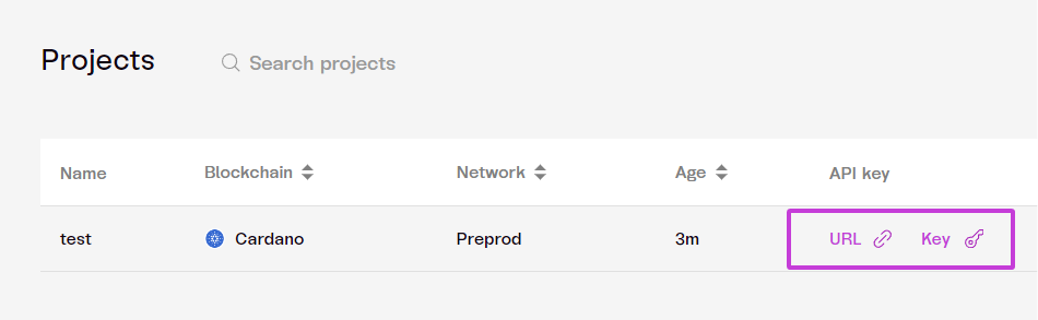 The Projects section will list all created projects. In this example, we will use theCardano Preprod