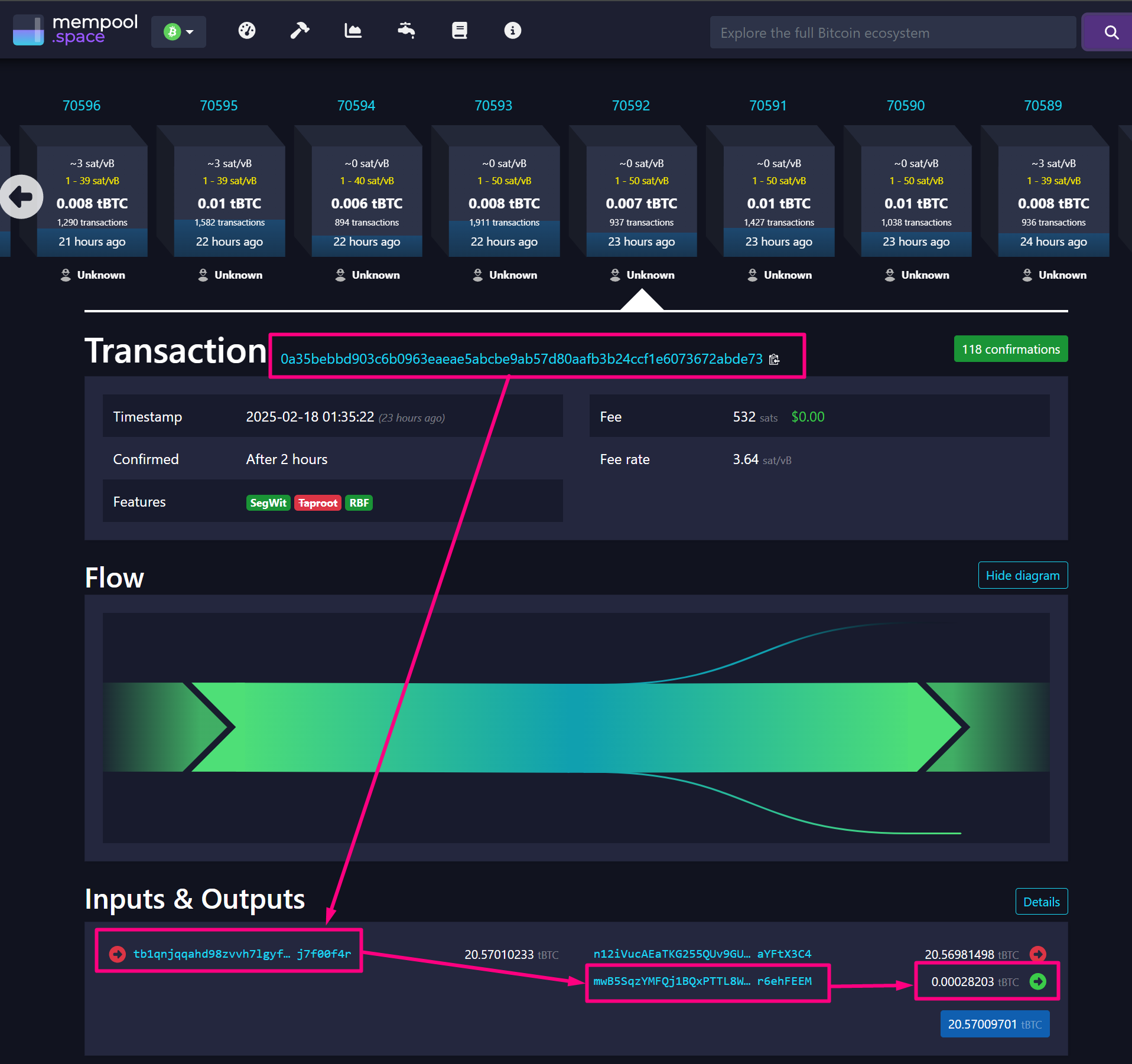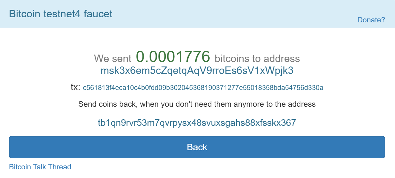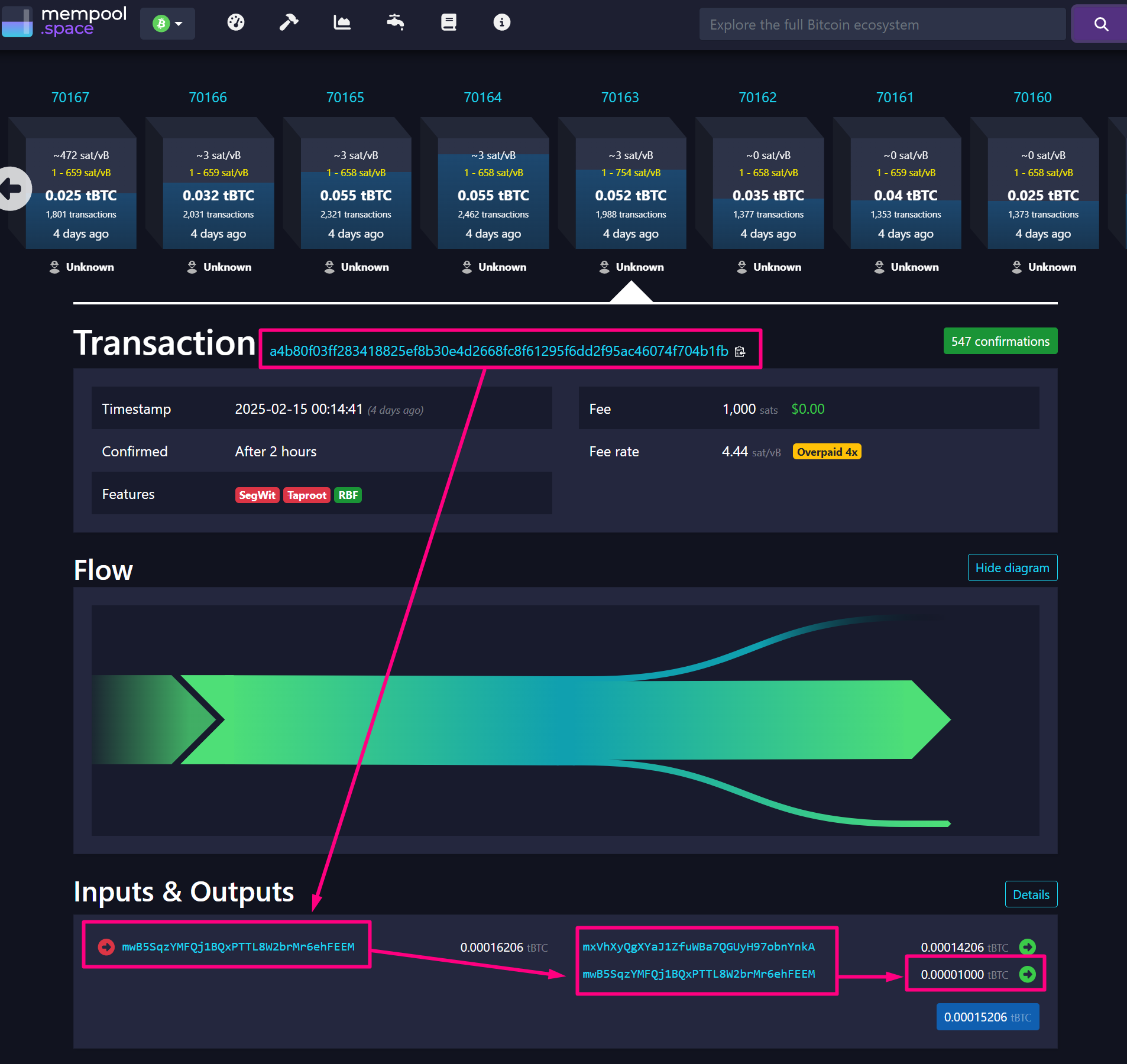 The Coin Faucet will send Test Bitcoin (tBTC) to our Address1 testnet4 wallet, generating a transaction (tx) that will be recorded on the Bitcoin Testnet4 blockchain.