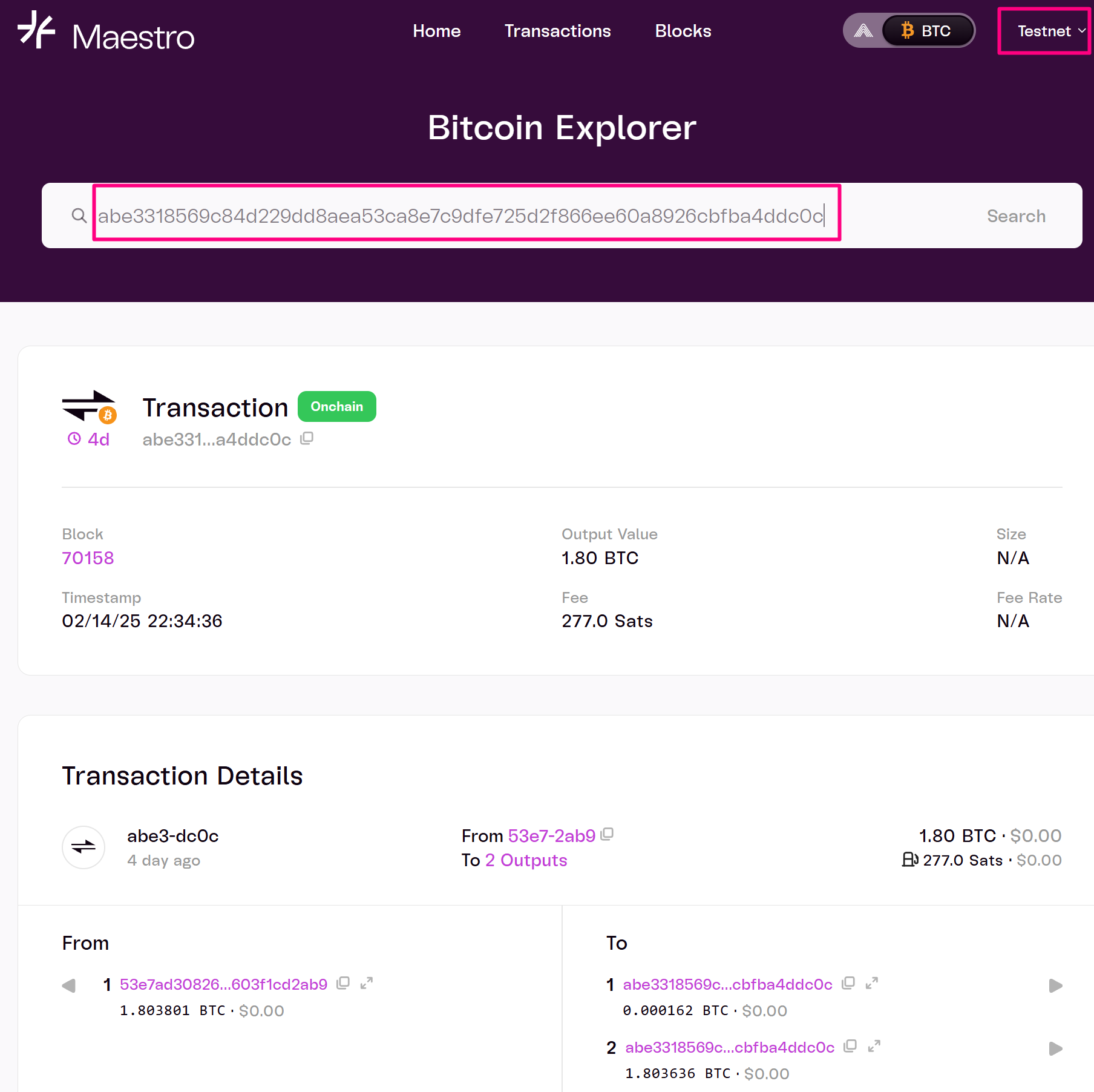 Maestro Bitcoin ExplorerYou can lookup the transaction by visiting explorer.gomaestro.org and entering the transaction id (txid).https://explorer.gomaestro.org/bitcoin/testnet/transactions/abe3318569c84d229dd8aea53ca8e7c9dfe725d2f866ee60a8926cbfba4ddc0c