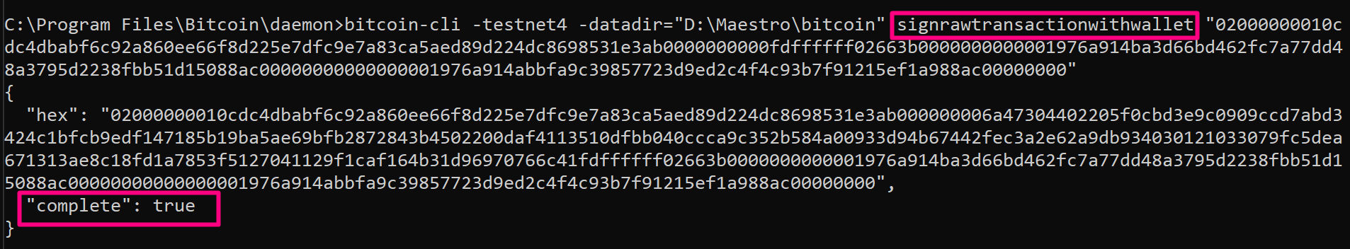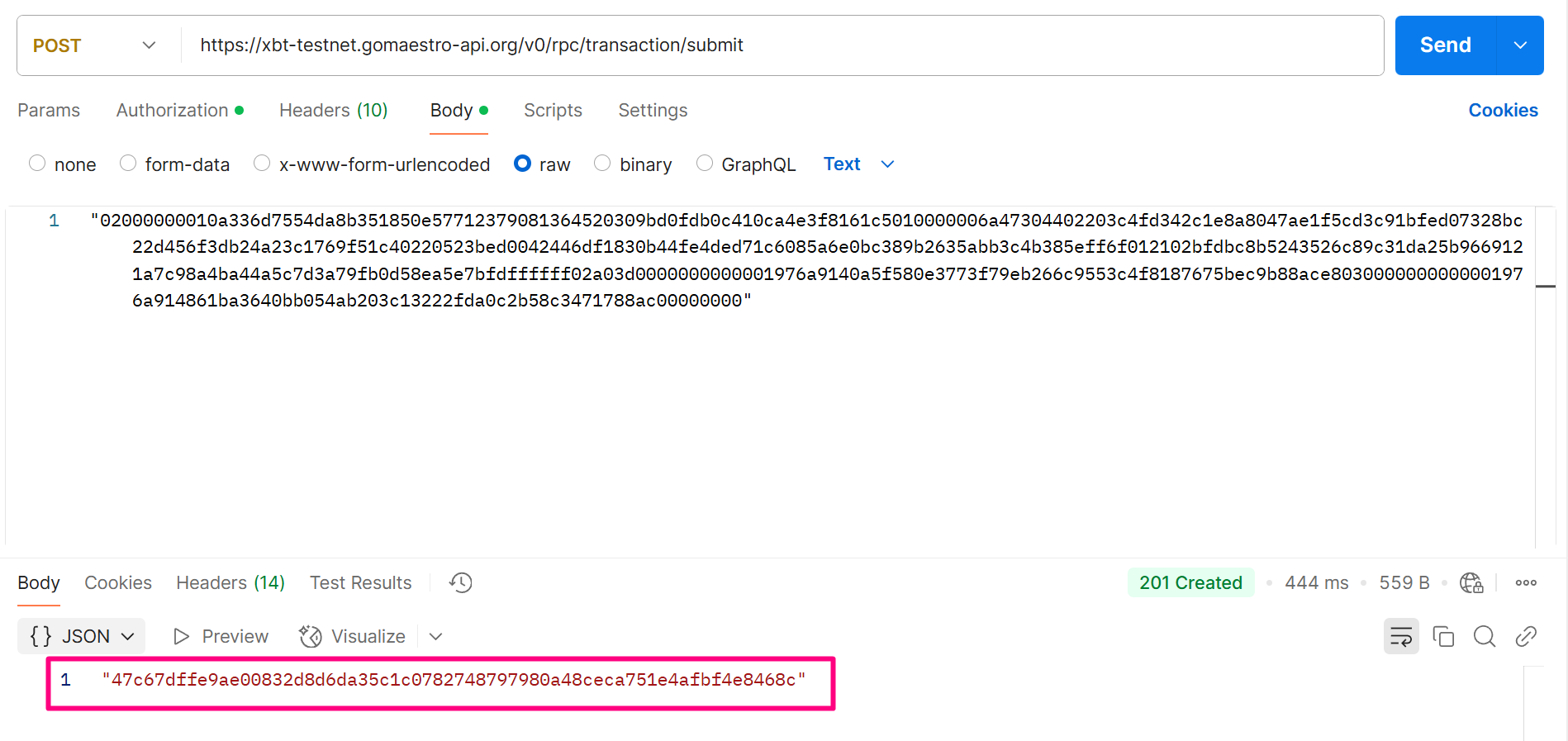 Use Maestro’s API to push the transaction to the Bitcoin network:If successful, the response includes the transaction ID.